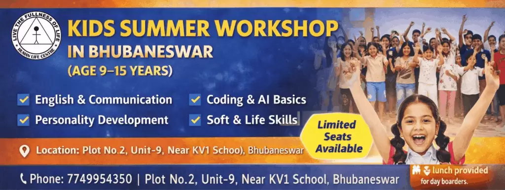 Kids Summer Workshop in Bhubaneswar – Human Life Centre’s Kids Summer Workshop is a 35-session structured program designed for children aged 9 to 15 years, combining English communication, digital & AI awareness, coding basics, personality development, and life skills — all under one roof.